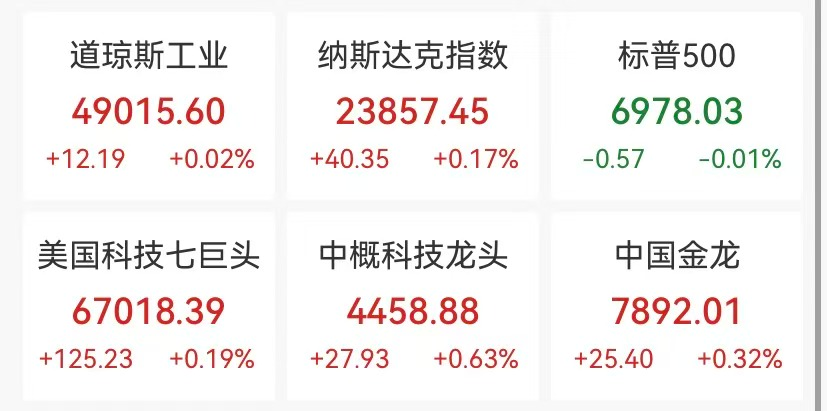 具体来看,科技七巨头涨跌互现,英伟达涨超1%,亚马逊、苹果、脸书均下跌约0.7%。